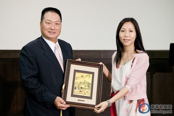 東森總裁王令麟(左)致贈郎世寧畫作「八峻圖」給來訪的廈門市商務局副局長鄭耀。(圖/ETtoday)
