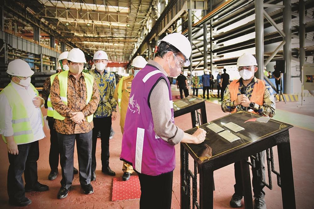 ▲印尼總統(tǒng)佐科視察象嶼印尼項(xiàng)目并在鑲有公司產(chǎn)品的石牌上簽字留念