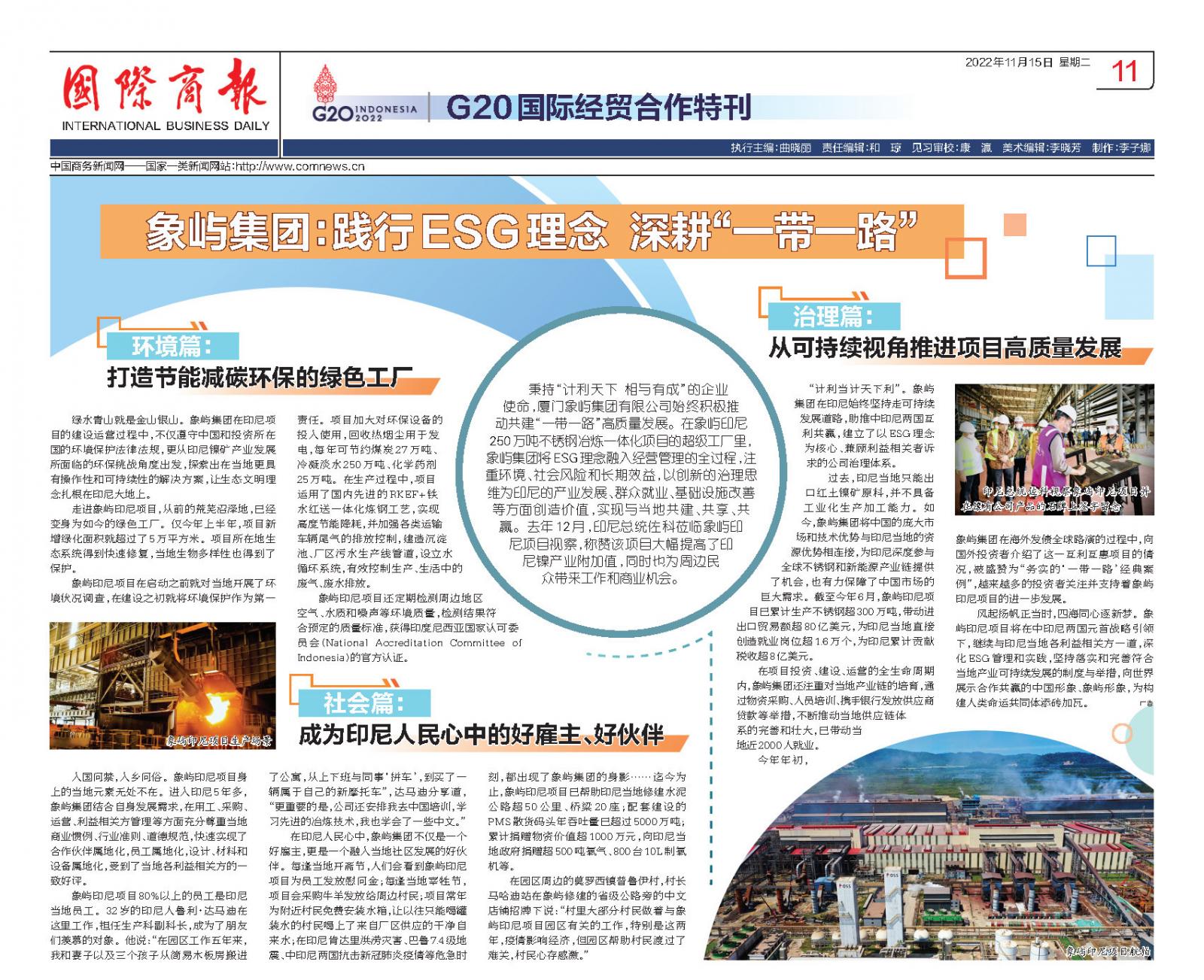 習(xí)近平主席近日出席二十國(guó)集團(tuán)領(lǐng)導(dǎo)人第十七次峰會(huì),這是黨的二十大勝利召開后,中國(guó)最高領(lǐng)導(dǎo)人首次出席多邊峰會(huì)。值此之際,商務(wù)部《國(guó)際商報(bào)》推出《G20國(guó)際經(jīng)貿(mào)合作特刊》,專版報(bào)道象嶼集團(tuán)作為中國(guó)國(guó)有企業(yè)出海、深耕“一帶一路”的典型代表,積極踐行ESG理念,為促進(jìn)產(chǎn)業(yè)鏈供應(yīng)鏈穩(wěn)定、人民福祉增加和社會(huì)文明進(jìn)步注入象嶼力量的生動(dòng)實(shí)踐,現(xiàn)全文轉(zhuǎn)載如下。