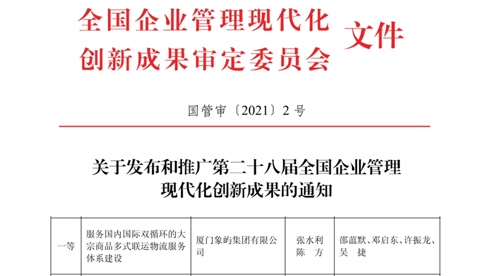 2022年,第二十八屆全國企業(yè)管理現(xiàn)代化創(chuàng)新成果名單發(fā)布,象嶼集團(tuán)憑借《服務(wù)國內(nèi)國際雙循環(huán)的大宗商品多式聯(lián)運(yùn)物流服務(wù)》榮獲一等獎(jiǎng),成為廈門首家獲評(píng)該獎(jiǎng)項(xiàng)一等獎(jiǎng)的企業(yè)。11月,倫敦設(shè)計(jì)獎(jiǎng)(London Design Awards)結(jié)果出爐,上海天安象嶼西江悅榮獲建筑設(shè)計(jì)類別最高獎(jiǎng)金獎(jiǎng),福州象嶼國貿(mào)星璟原獲展示空間銀獎(jiǎng)。此外,2020-2021年度全國企業(yè)文化優(yōu)秀成果一等獎(jiǎng)、2022金蜜蜂企業(yè)社會(huì)責(zé)任·中國榜“ESG競爭力·責(zé)任采購”獎(jiǎng)、福建五一勞動(dòng)獎(jiǎng)狀、福建省優(yōu)秀企業(yè)家等重磅獎(jiǎng)項(xiàng)也先后花落象嶼,凸顯社會(huì)對(duì)象嶼的高度認(rèn)可。