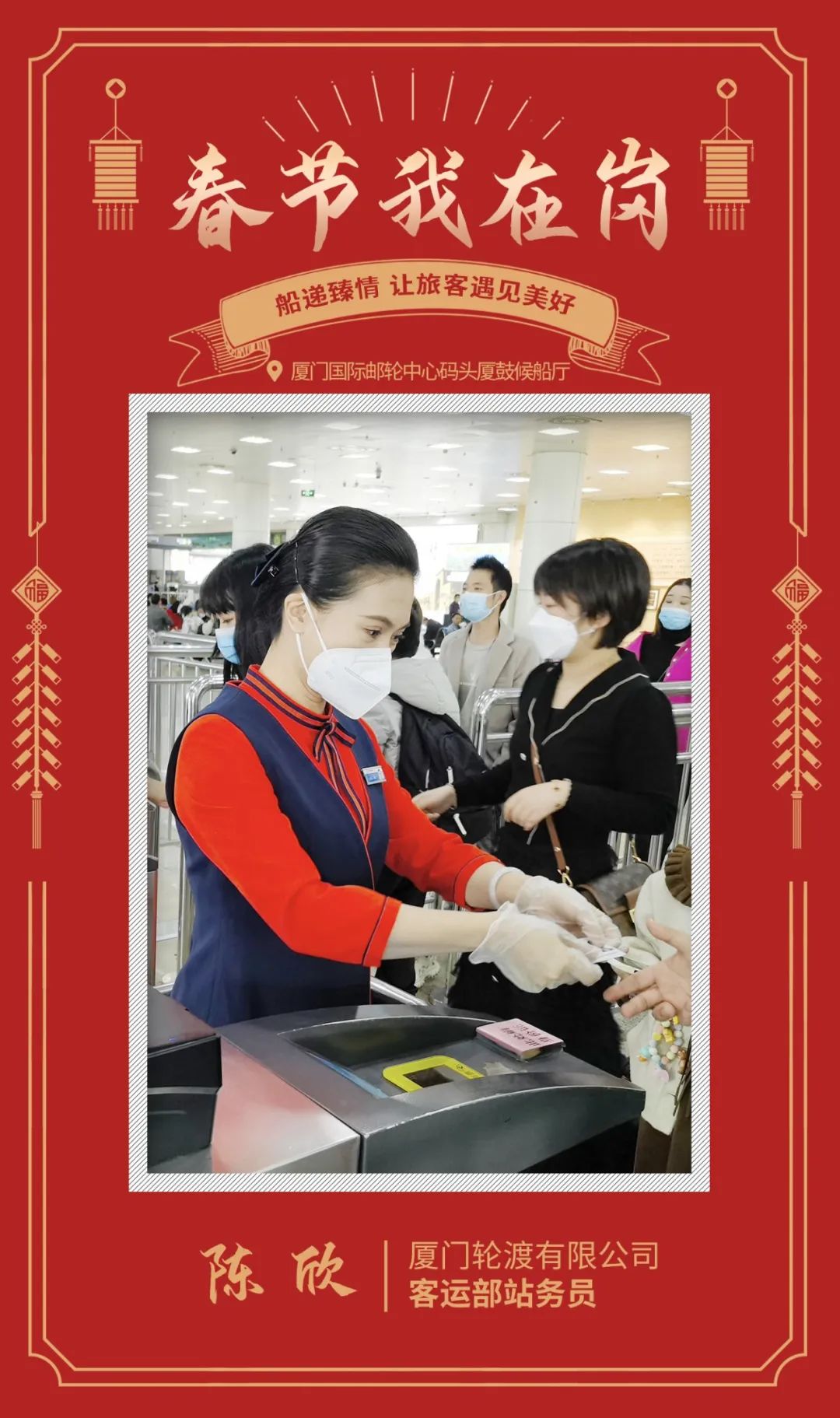 隨著廈門旅游市場(chǎng)的逐步復(fù)蘇,今年春節(jié)期間游客客運(yùn)量預(yù)計(jì)將出現(xiàn)較大增幅。為保障游客開心安心出行,讓他們?cè)诠睦藥Z之旅中遇見美好,陳欣選擇堅(jiān)守崗位,船遞臻情。