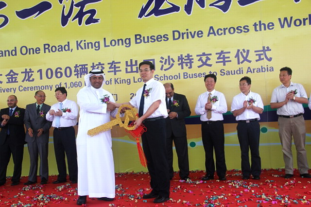 6月18日上午,“大金龍”1060輛校車出口沙特交車儀式在福建廈門現(xiàn)代碼頭舉行。此系今年以來中國客車出口第一大單。廈門市副市長林銳向大金龍沙特用戶代表交付了金鑰匙。隨著1060輛校車啟程前往沙特為學子護航,福建沿海與阿拉伯海這條古老的海上絲綢之路,開啟了新時期貿易合作的大幕。