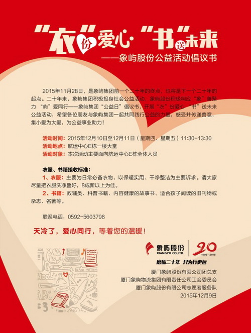 象嶼股份、象嶼高尚物業(yè)、閩臺中心漁港和自貿(mào)區(qū)開發(fā)公司的員工們自發(fā)自覺開展了捐贈衣物和書籍的活動,給西部貧困山區(qū)送去溫暖和愛心。募捐處甚至還收到不留名的大包衣物。