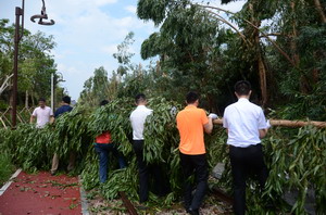 象嶼集團陳方副總裁、邵蕰默副書記、林俊杰副總裁等領(lǐng)導(dǎo),上午奔波在島內(nèi)外察看災(zāi)情,為了參與志愿服務(wù),中午匆忙扒了兩口飯就趕回來,率先垂范,身穿志愿者紅馬甲,頭頂烈日,撿樹枝、清障礙,汗水濕透了衣衫。