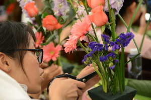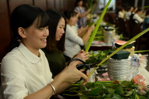 寫上對集團(tuán)的祝福,女職工們辦了一個(gè)插花作品秀