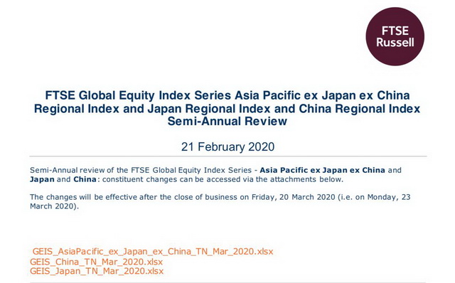 北京時(shí)間2月21日,全球第二大指數(shù)公司富時(shí)羅素公布了其旗艦指數(shù)2020年2月的季度調(diào)整結(jié)果。廈門象嶼(600057.SH)首次入選其旗艦指數(shù)——富時(shí)全球股票指數(shù)系列(下簡(jiǎn)稱富時(shí)GEIS),標(biāo)志著廈門象嶼進(jìn)一步受到國(guó)際投資者關(guān)注。此次入選將于2020年3月23日開盤前正式生效。