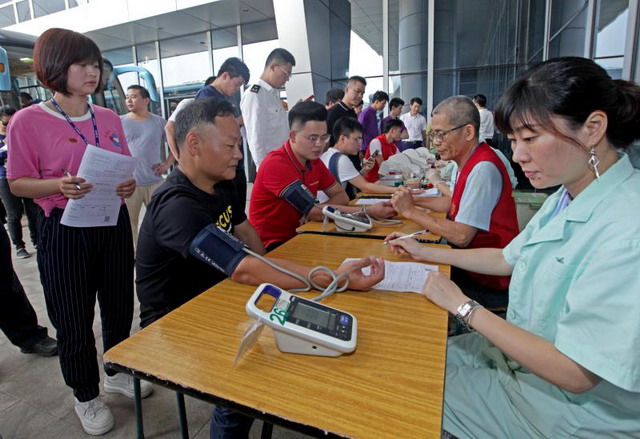 現(xiàn)場志愿者排隊登記獻(xiàn)血。