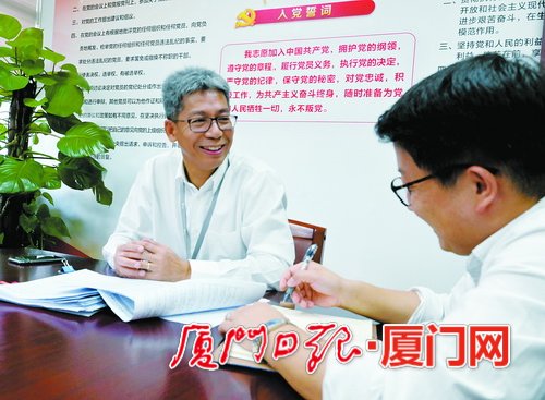 象嶼股份黨委副書記、副總經(jīng)理齊衛(wèi)東(左)跟員工探討項(xiàng)目落實(shí)情況。(《廈門日?qǐng)?bào)》記者黃曉珍攝)