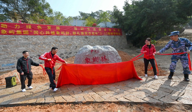 ▲象嶼集團、駐廈某部隊、廈門外國語學校湖里分校、東榮社區(qū)領導共同為象嶼林揭碑。