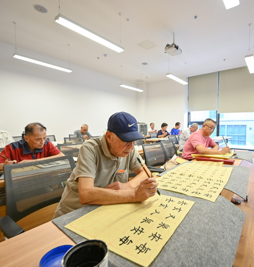 在廈門象嶼慈愛老年養(yǎng)護(hù)中心的書畫室里,長者們正在老師的耐心教授下用心練毛筆字。他們中,既有入住養(yǎng)護(hù)中心的長者,也有來自周邊社區(qū)的退休老人。