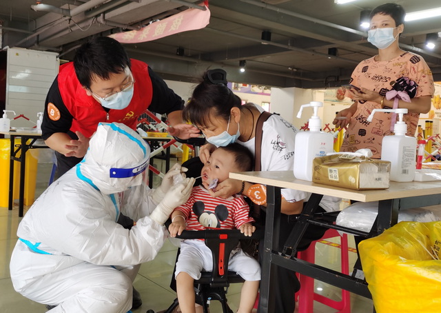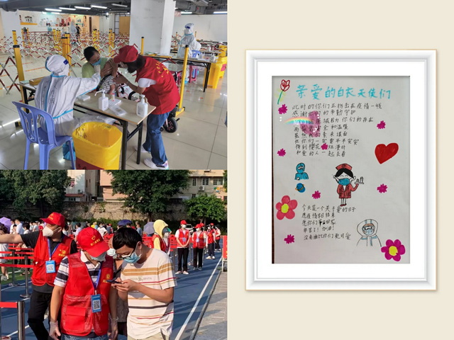 來自象嶼速傳黨辦的禇穎與她愛人齊上陣,兩人錯開時間進行志愿服務,一人在外幫助市民進行核酸檢測,一人在家照顧孩子,既顧好“小家”也顧著“大家”。